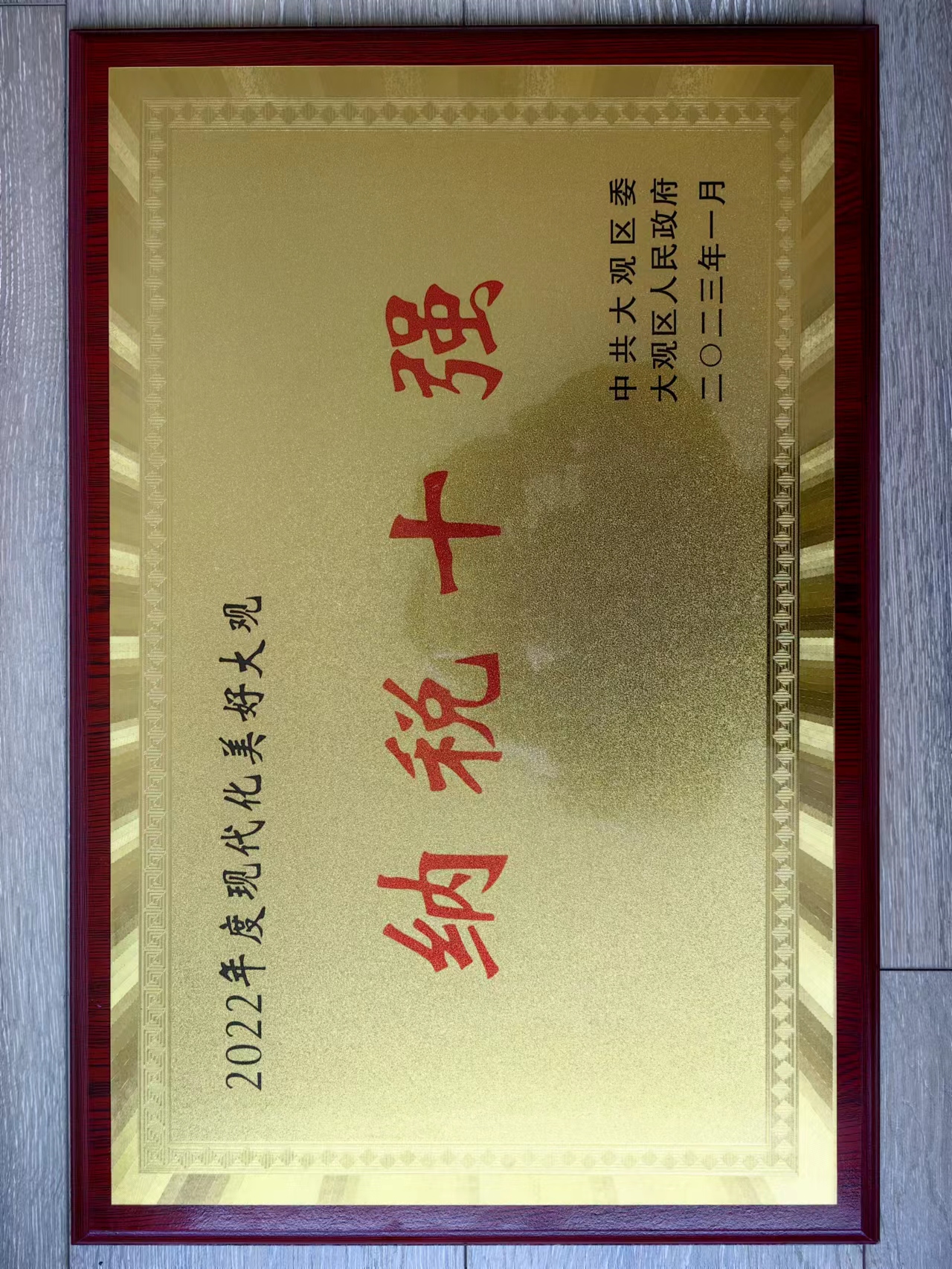 熱烈祝賀我公司榮獲安慶市大觀區“2022年度納稅十強”榮譽稱號