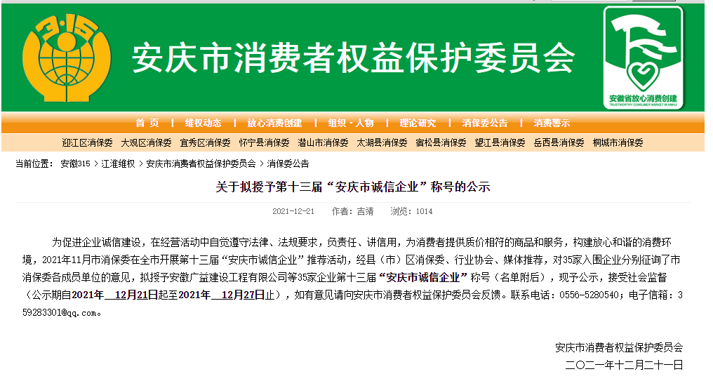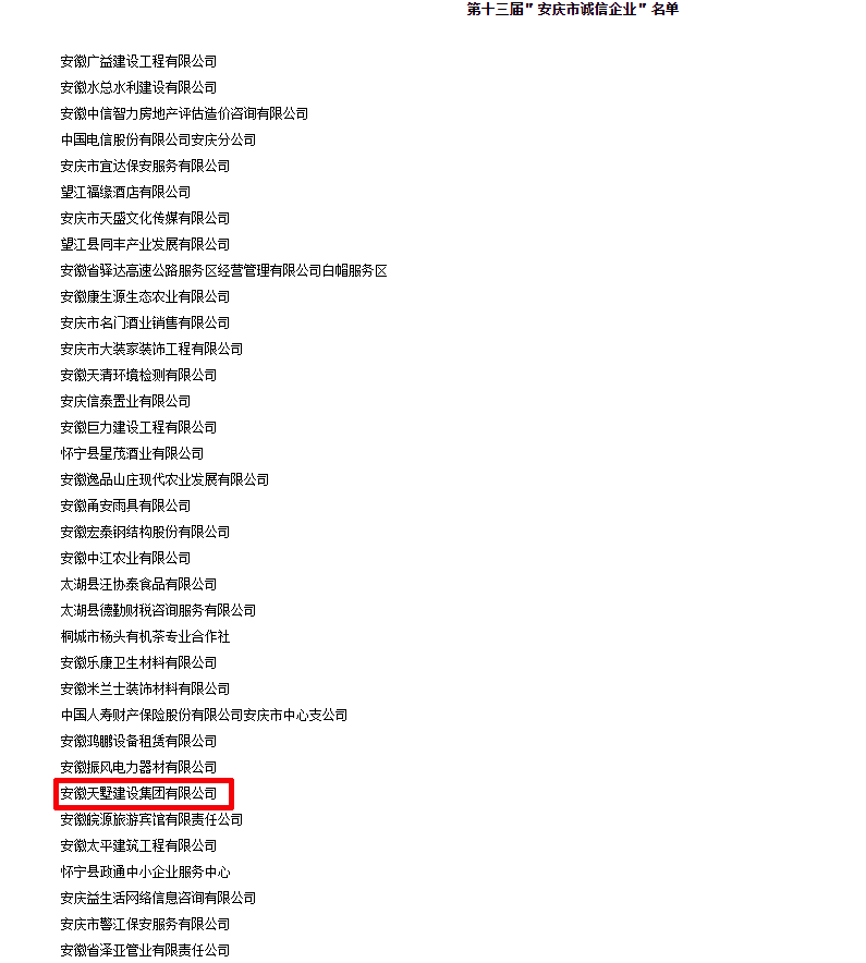 榮譽||天墅集團榮獲第十三屆“安慶市誠信企業”稱號