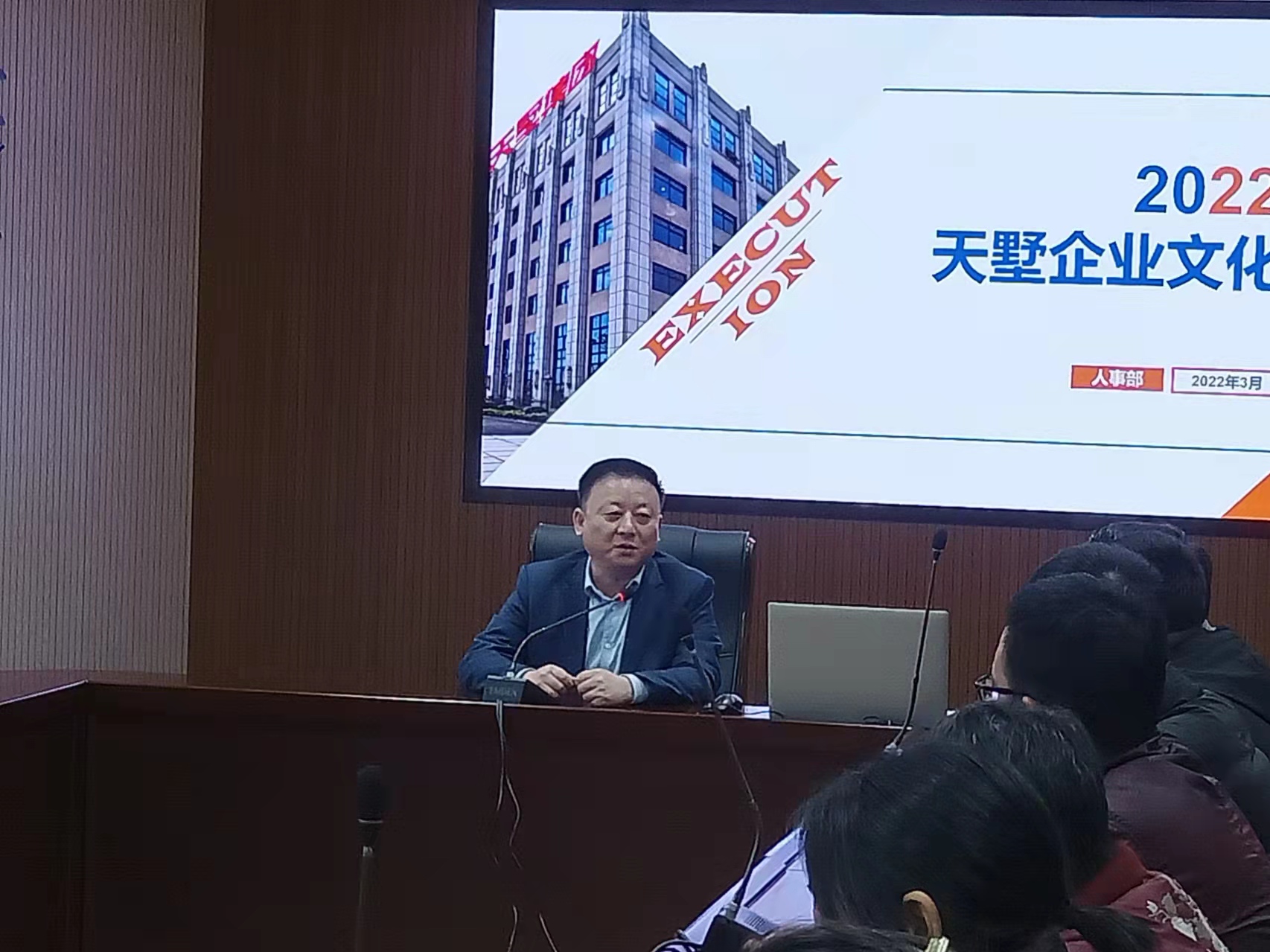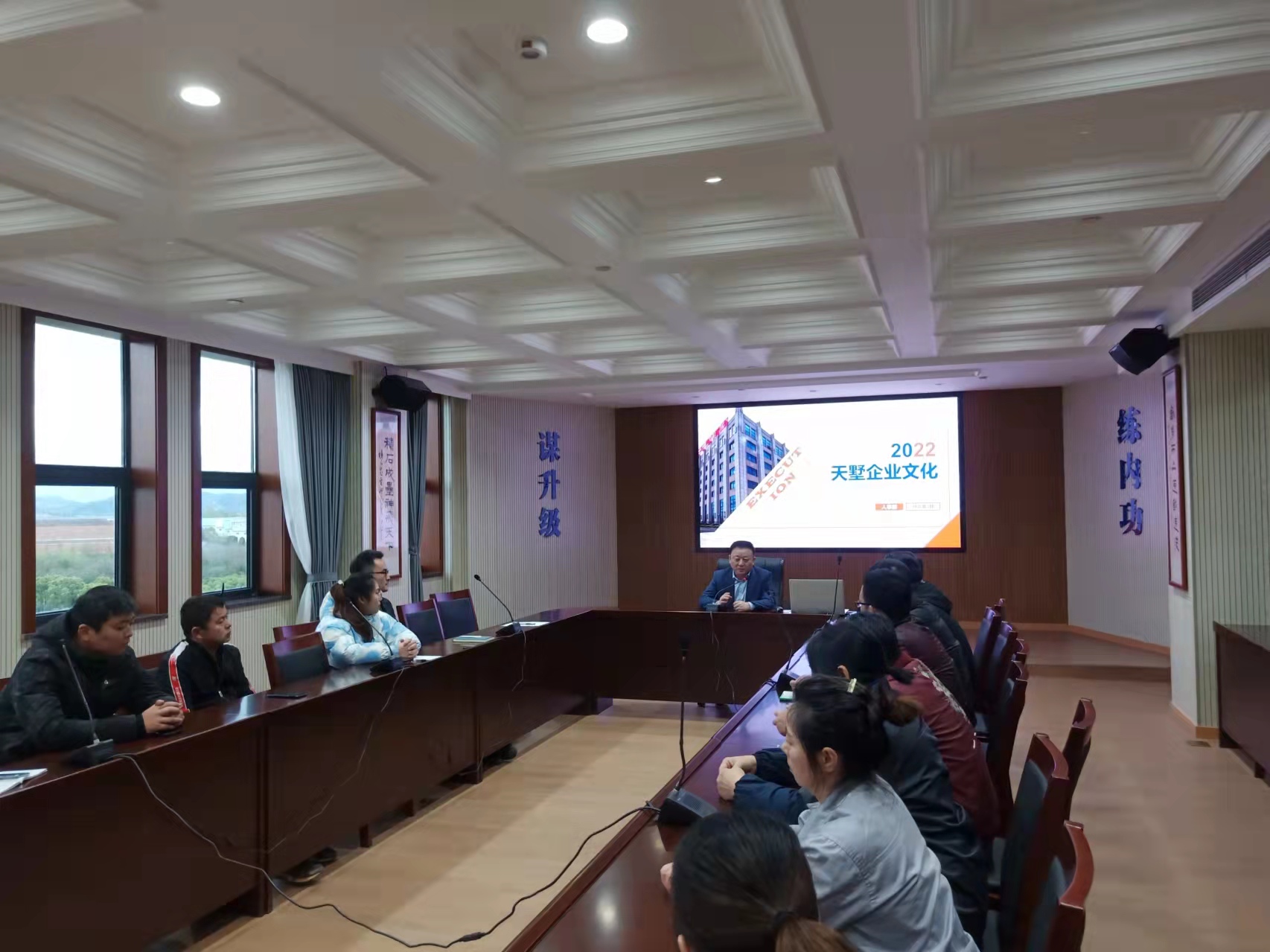 3月17日下午,天墅集團人事部組織2022年第一批新入職員工培訓會,公司董事長、總經理與新入職員工進行集中座談,朱總作了言辭懇切的寄語發言。