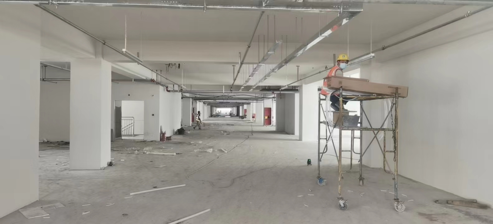 在地下停車場改造施工現場,與上月份相比,工程已經初見雛形,工人們有的在忙著吊頂,有的在進行綜合橋架施工。據汪經理介紹,“工程主要包括消防管道、噴淋管道、火災報警器、空調系統和照明的安裝等。智能化工程包括智慧停車和反向尋車、廣播、門禁等。”安裝工程、智能化工程這二項工程在穿插進行中,預計到9月底,準備各類設備調試工作。