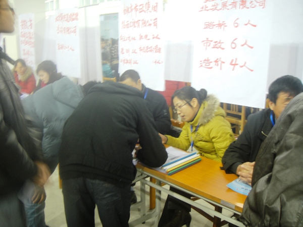20091212,安徽交通職業技術學院舉辦“2010屆畢業生校園招聘會”,該院畢業生一直以來因其基礎知識扎實,動手能力強受到我公司人力資源部門青睞。為給畢業生一個放飛夢想、暢想青春的舞臺,我公司非常重視這次招聘會,欣然應邀參會選拔優秀人才。本次招聘主要是路橋、造價和市政專業人員。招聘會上學生們氣氛活躍,咨詢和報名非常踴躍。