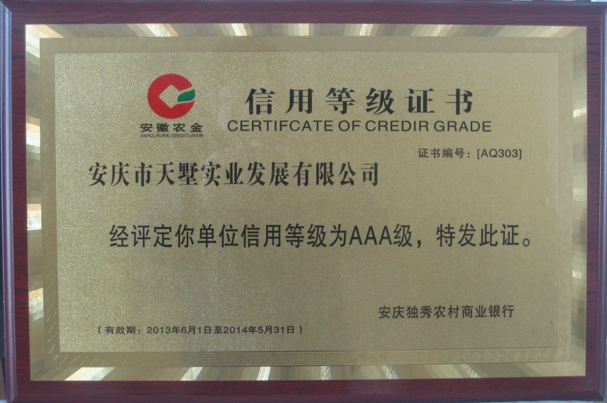 近日,公司再次榮獲安徽農(nóng)金·安慶市獨(dú)秀農(nóng)商行頒發(fā)的AAA信用等級(jí)證書。作為安慶市最具活力的金融單位之一,安慶市獨(dú)秀農(nóng)商行多年來對(duì)我公司的發(fā)展給予了極大的關(guān)注和支持,我公司也不負(fù)所望,連年以倍增的業(yè)績(jī)和健康的現(xiàn)金流穩(wěn)步快速的發(fā)展。此次授信正是銀企牽手的最佳佐證。
