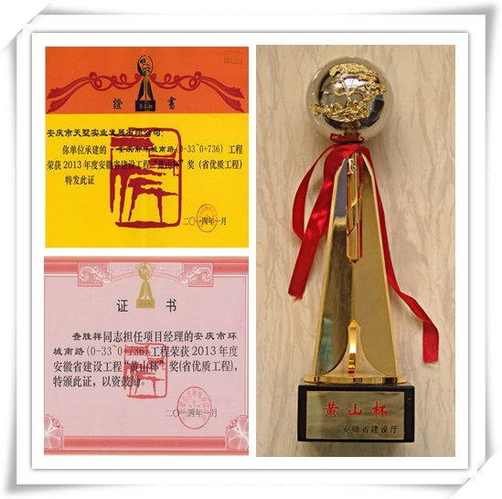 截至目前,我公司已有3項工程獲得安徽省建設工程“黃山杯”獎,另外兩項工程分別是安慶市振風大道二期工程和安慶市皖江大道改建工程。這些榮譽既是對天墅實業同仁辛勤付出的充分肯定,也彰顯了天墅人對質量、品質的執著追求。