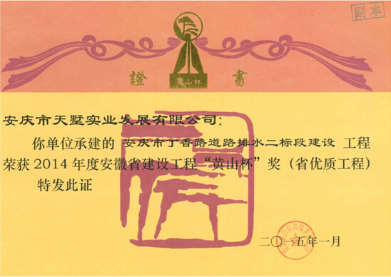 日前,由我公司承建的安慶市丁香路道路、排水二標段建設(shè)工程喜獲2014年度安徽省建設(shè)工程“黃山杯”獎(省優(yōu)質(zhì)工程),這也是我司繼振風(fēng)大道、皖江大道等項目后再次斬獲的“黃山杯”獎項。