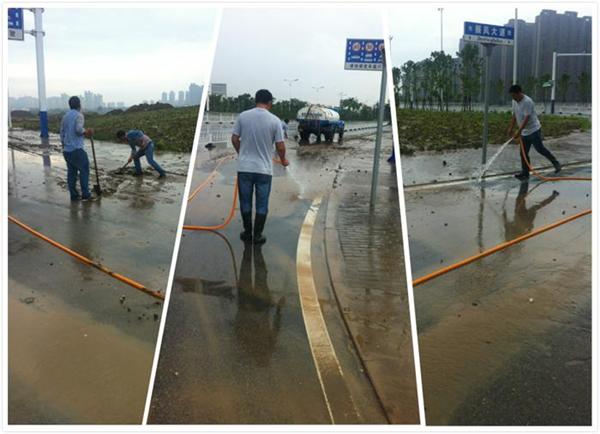 7月23日至25日,我市普降中到大雨,以致順安路與振風大道交叉口的新河景觀工程施工段沿線,大量土方被雨水沖刷至慢車道。26日早上7:30,我市再遇強降雨,我公司黃日新、江浩、雍軍紅三名同志犧牲休息時間,冒雨主動對慢車道上的泥土進行清理,并沖洗路面,確保了該路段的路面整潔。由于沖洗范圍廣,工作量大,三人的手掌全部磨泡,渾身上下汗水、雨水全部濕透。他們這種“和身而上,速戰速決”的工作精神令人感動,值得肯定,希望公司上下各級員工自覺主動向他們學習,遇到困難不躲,遇到難題不怕,積極主動干實事,在強化工作技能的同時提升職業素養,踏實肯干、不畏艱苦,為公司發展做出自己的努力。