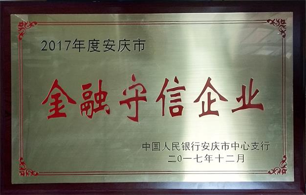 根據《安慶市金融守信企業評定實施辦法》,經市中級人民法院、市住建委、國稅局、地稅局、工商質監局、環保局、公路局等部門的評議,并由安慶市銀行行長聯席會議評定,授予我司為2017年度安慶市“金融守信企業”榮譽稱號。