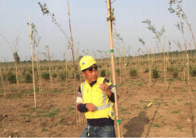 5月9日,工作人員正在對現(xiàn)場苗木進(jìn)行RTK定位。