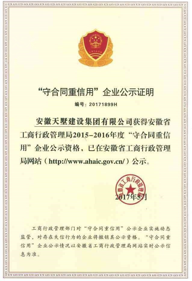近日,天墅建設(shè)集團(tuán)公司憑借完善的誠信體系和多年的誠信經(jīng)營(yíng),再次被評(píng)定為2015-2016年度安徽省“守合同重信用企業(yè)”。據(jù)悉,公司此前已連續(xù)多年被評(píng)為安徽省“守合同重信用企業(yè)”。